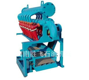當具(jù)有一定(dìng)壓力(lì)(0.2-0.45MPa)的鑽井液通過進口管匯,沿(yán)旋流器內壁切向進入旋流器圓筒體(tǐ)並高速(sù)向下(xià)螺旋旋轉時,產生了巨大的離心力場,大量的輕質鑽井液由中心的低壓區螺旋上升(shēng),從溢流口排入鑽井液循環罐中,鑽井液中較重的固相顆粒在離心力的作用下被甩向街壁,並在(zài)鑽井液向下旋轉的推力和自重作用下沿旋流器內壁螺旋下沉,從底流口排(pái)出(chū)並流至篩麵,經過振動篩的端分,少量鑽井液與團相顆粒得到分離,從而起到淨化鑽井液的作用。